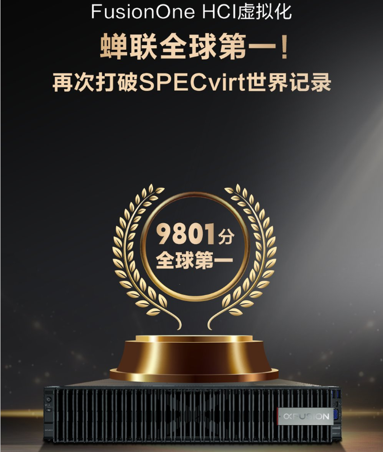 近日,国际权威性能测评机构SPEC发布新一期虚拟化性能测评结果,超聚变FusionOne HCI虚拟化系统打破SPECvirt世界纪录,基于第五代英特尔®至强®可扩展处理器,实现在一台FusionServer 2288H V7双路服务器上满载稳定运行546个高负载虚机,性能总分相比上一代提升30%,提升至9801分。